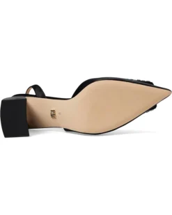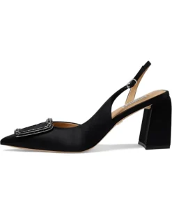 - The Badgley Mischka® Adaline is a block heel pump with a decorative square buckle and pointed toe. With a buckle adjustable slingback strap closure, the sandal has silk upper construction and breathable leather lining for all-day comfort.