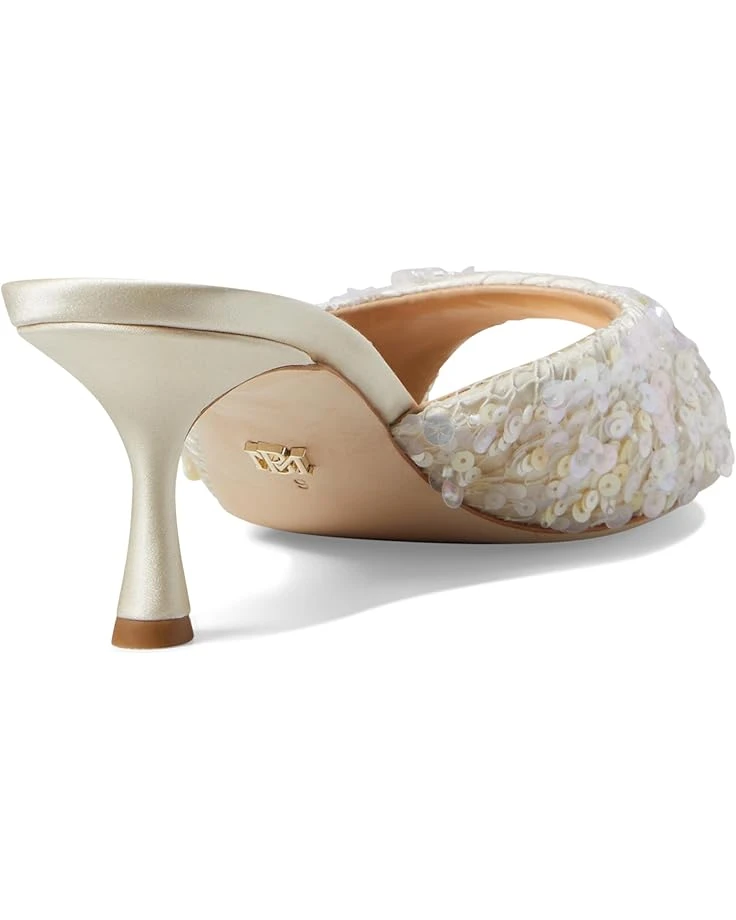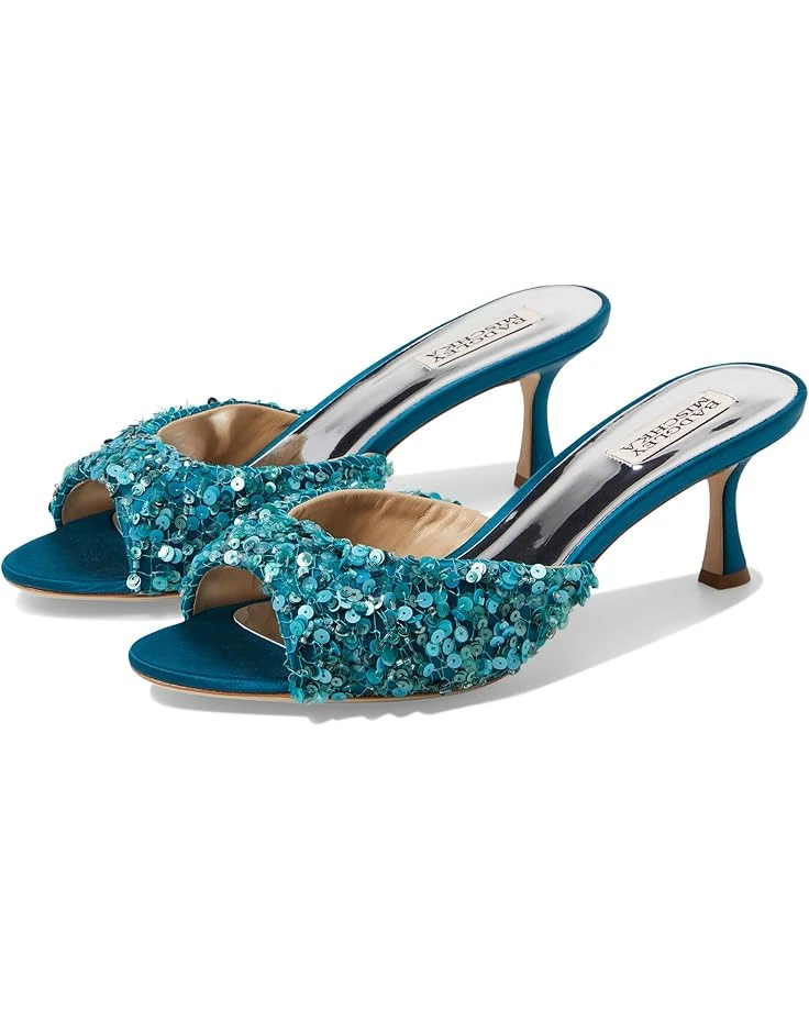 - Indulge in elegance with Badgley Mischka® Candie sandals. These exquisite mule sandals feature a delicate kitten heel, providing both sophistication and comfort. Adorned with shimmering sequins on the upper, these almond toe mules add a touch of glamor to any ensemble.