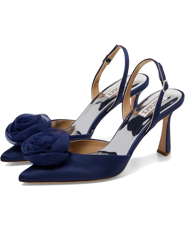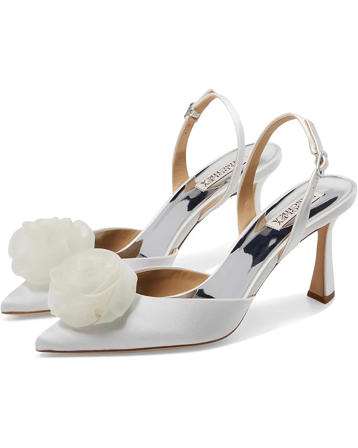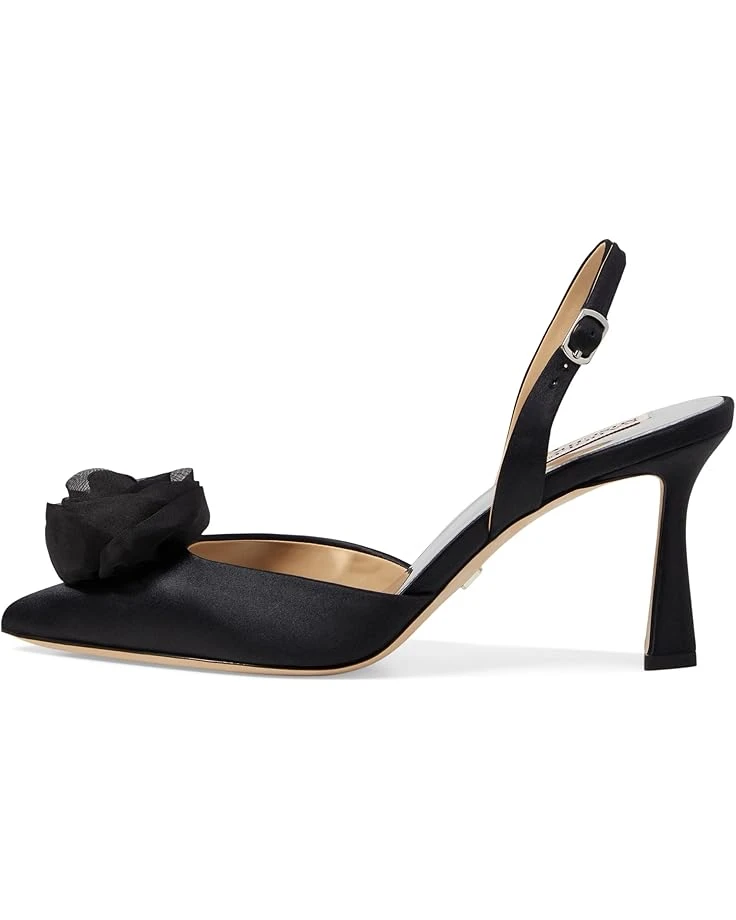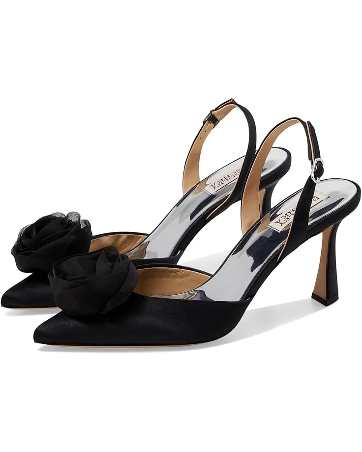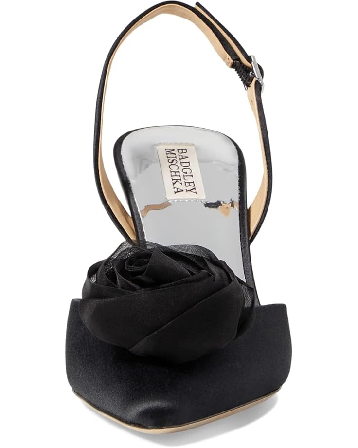 - Step into sophistication with Badgley Mischka® Carlise pumps. These elegant heels feature a pointed toe design that exudes timeless charm and versatility. Adorned with a delicate rosette detail on the upper, these stiletto heel pumps add a touch of romance to any ensemble.