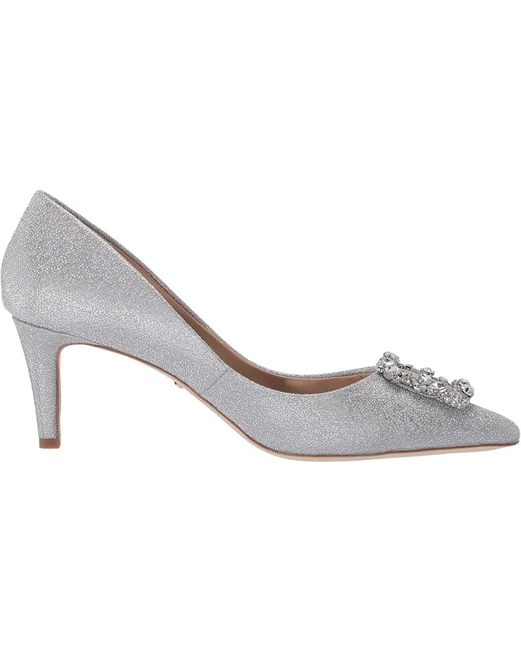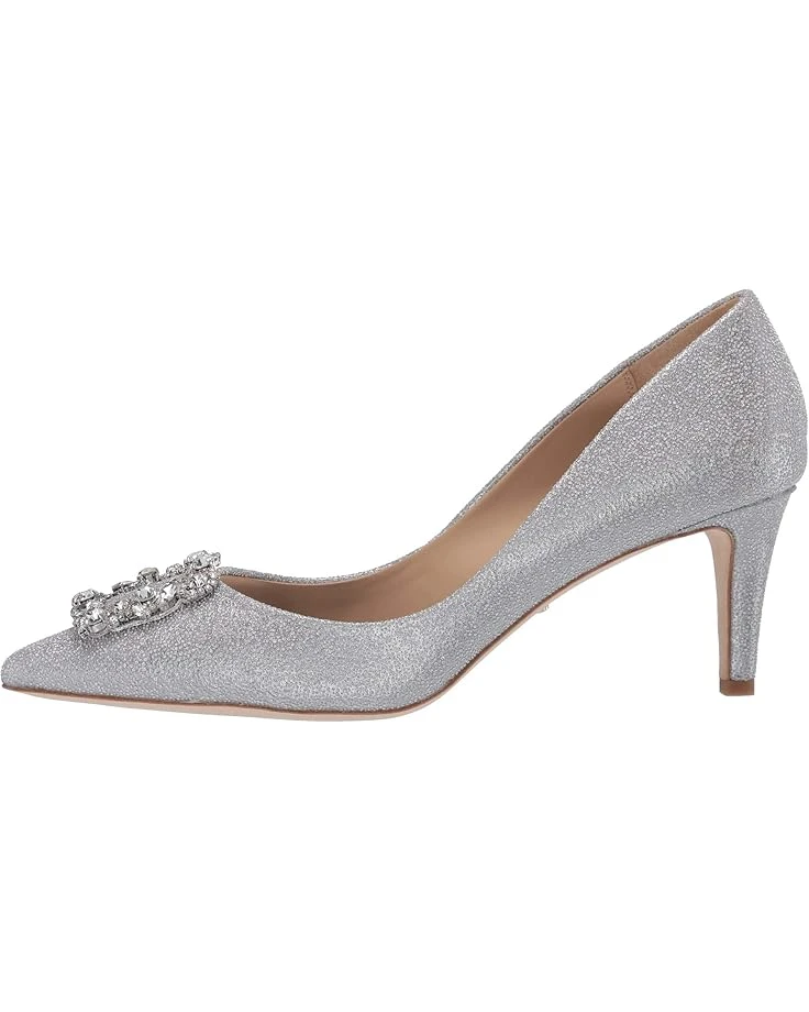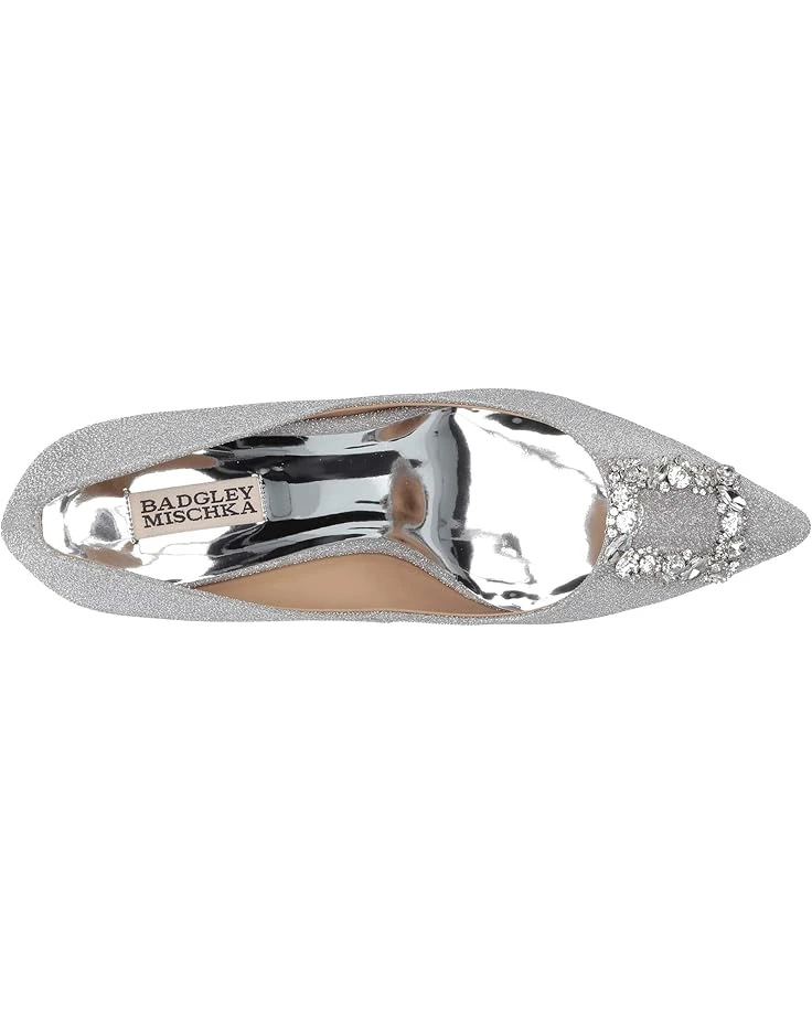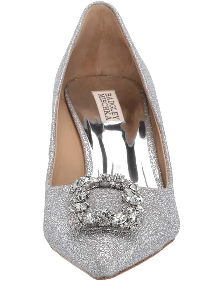 - Complete your ensemble with the stunning Badgley Mischka® Carrie pump. It’s crafted with a textile upper and set on a kitten heel, and features a gorgeous crystal brooch atop the pointed toe.