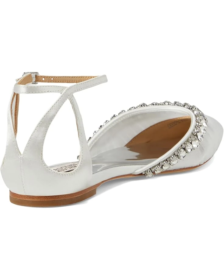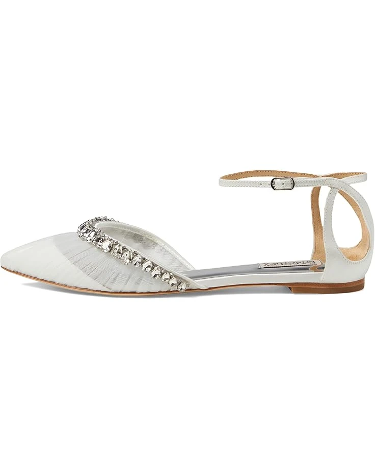 - Make your day more special by wearing Badgley Mischka® Evelynn footwear. The pointy toe with pyramid crystal embellishments makes it elegant. It has a strappy buckle ankle strap. The footwear is made of satin upper, leather lining, and synthetic footbed.