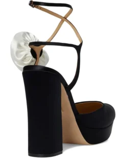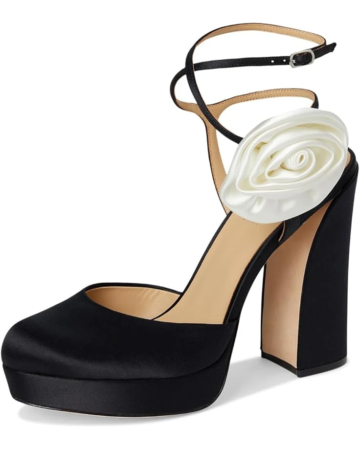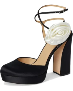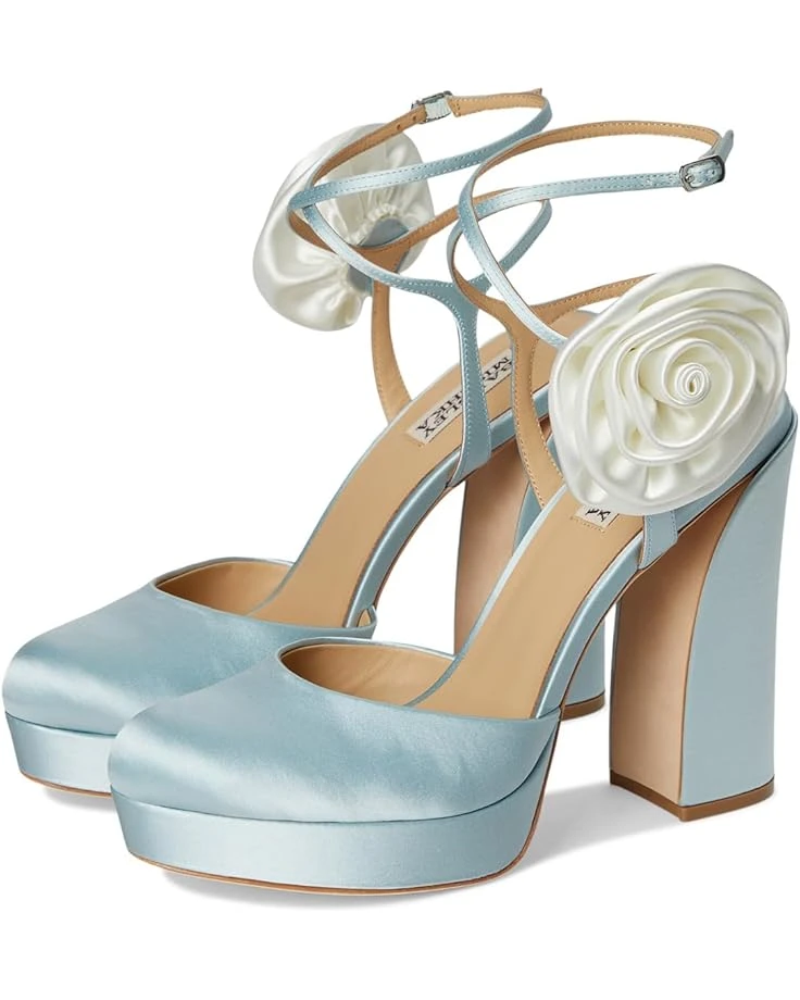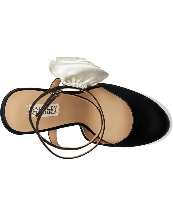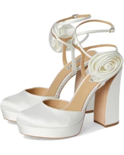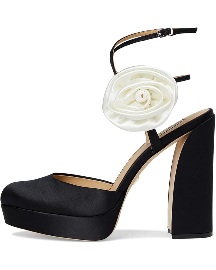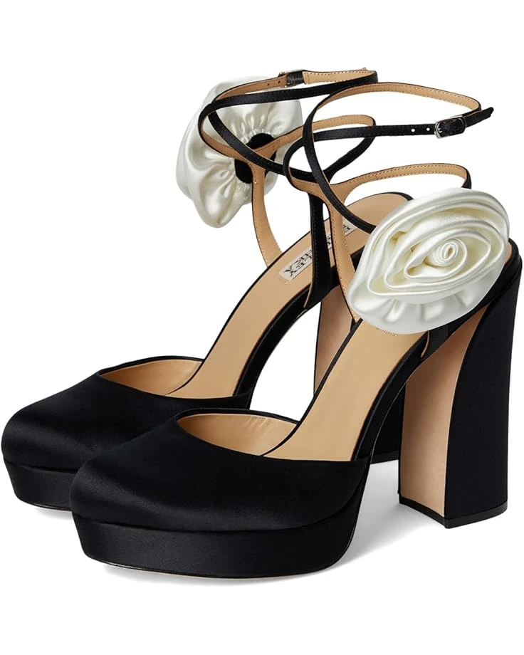 - Discover a new level of elegance wearing Badgley Mischka® Janessa – a stunning blend of sophistication and statement-making style. Featuring a luxurious silk upper adorned with an oversized flower, these platform pumps are your go-to for standout occasions. The leather lining and outsole promise breathable comfort, while the EVA insole cushions every step. A sleek buckle ankle strap ensures a secure fit, and the block heel adds height with stability.