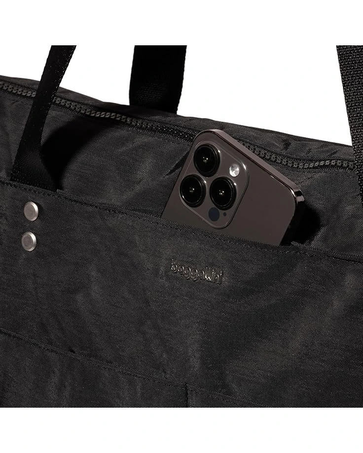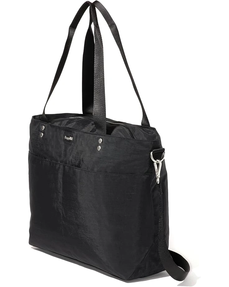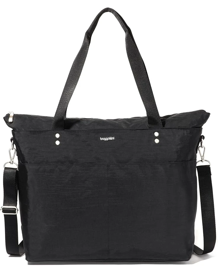 - With the ability to be worn as a shoulder bag or crossbody, this spacious Baggallini® Carryall Laptop Tote is a must-have for your work week, upcoming travels, or trips. Store your computer in the secure 15″ padded laptop sleeve. For smaller items that require fast access, exterior slip pockets and an anti-theft card wristlet have you covered. Constructed from durable nylon material, this versatile bag features a removable and adjustable crossbody strap, dual grab handles, and a zippered top closure.